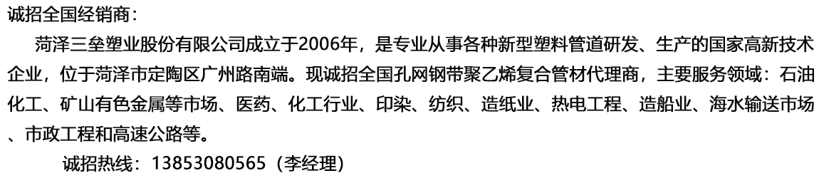 菏澤三壘塑業股份有限公司專業從事各種新型塑料管道研發(fā)和生產,重點研發(fā)了孔網鋼帶聚乙烯復合管材